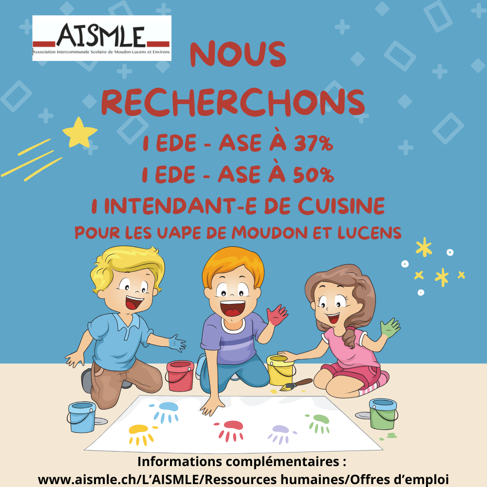 Nous recherchons 1 EDE-ASE à 50%, 1 EDE-ASE à 37% et 1 intendant-e de cuisine pour les UAPE de Moudon et Lucens. Plus d'infos. ...